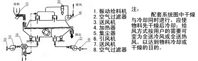 所谓振动流化床就是在普通流化床的基础上施加振动而成。振动流化床干燥机是由振动电机产生激振力使机器振动,被处理物料就是在这给定方向的激振力的作用下跳跃前进,同时流化床底部输入的热风使物料处于流化状态。物料与热风充分接触,从而达到理想的干燥效果。